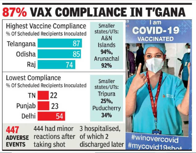 चार राज्यों – तमिलनाडु, पंजाब, त्रिपुरा और पुदुचेरी – में लाभार्थियों का कम मतदान 22-34% की सीमा में दर्ज किया गया, जबकि अन्य राज्यों में 16 और 17 जनवरी को टीकाकरण के लिए निर्धारित किए गए लोगों की 50% से अधिक उपस्थिति दर्ज की गई। दिल्ली और जम्मू और कश्मीर में 54% की गिरावट दर्ज की गई। TOI ने विशेष रूप से डेटा की समीक्षा की है।