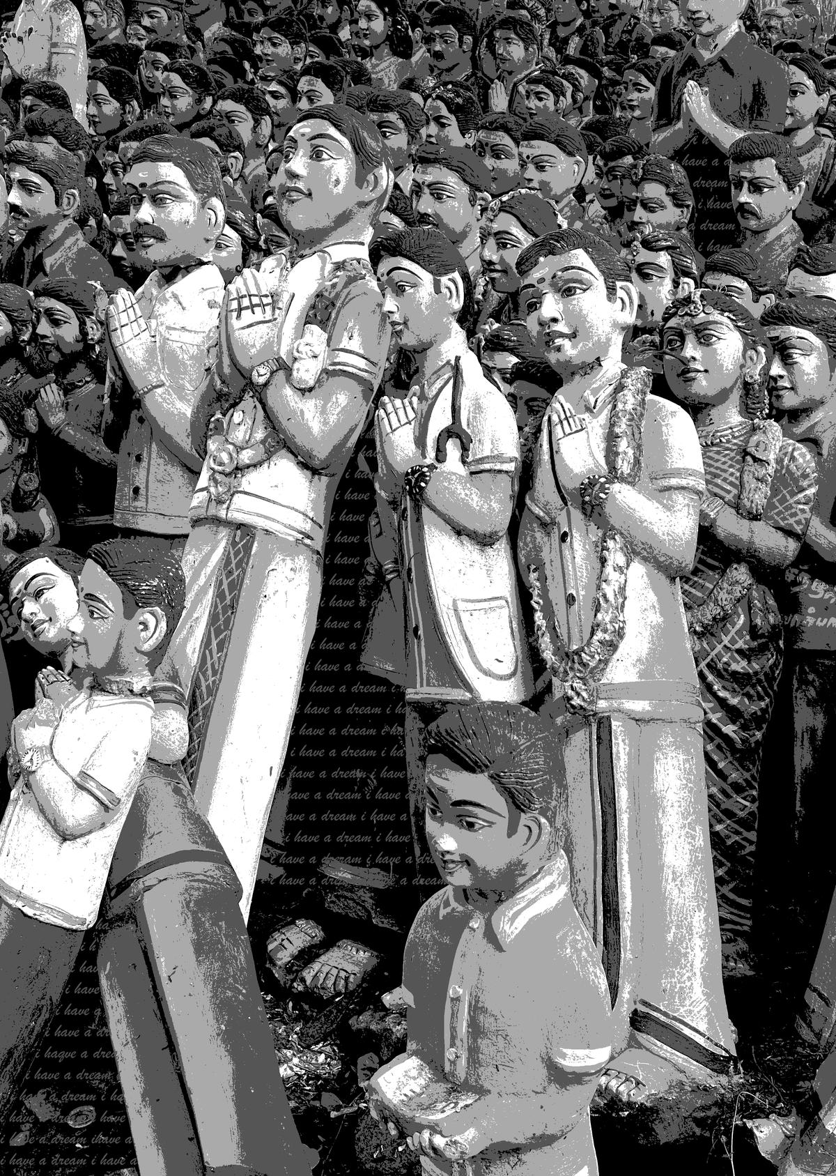 कई तस्वीरों में जॉर्ज द्वारा लिखी गई कविता के पाठ हैं। 72 वर्षीय कलाकार ने बहुत कम विवरणों को छुआ है जैसे बिंदीतथा तिलक माथे पर और आंखों को रंग दिया। अचानक मूर्तियाँ एक दूसरे को देखते हुए जीवित हो उठती हैं। एक बूढ़ी औरत एक छोटे जोड़े को देख रही है, और एक सज्जन दूसरे दोस्त को देख रहे हैं; हर कोई अपने विचार सोचता है और अपने सपने देखता है।