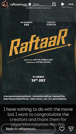 सोमवार (16 मार्च) को अपनी इंस्टाग्राम स्टोरीज़ पर रफ़्तार ने एक हल्के-फुल्के संदेश के साथ अटकलों का जवाब दिया। फिल्म के पीछे की टीम को बधाई देते हुए उन्होंने यह भी स्पष्ट किया कि इस परियोजना में उनकी कोई भागीदारी नहीं है।