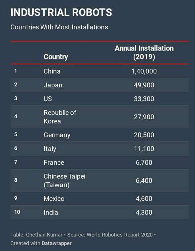 चीन सबसे अधिक संख्या में औद्योगिक रोबोटों को जोड़ने वाली तालिका में सबसे ऊपर है – एक ऐसी प्रणाली जो स्वचालित, प्रोग्राम करने योग्य और तीन या अधिक अक्षों पर आंदोलन करने में सक्षम है और विनिर्माण के लिए उपयोग की जाती है – और अब तक काम करने वाली ऐसी मशीनों की संख्या भी सबसे अधिक है।